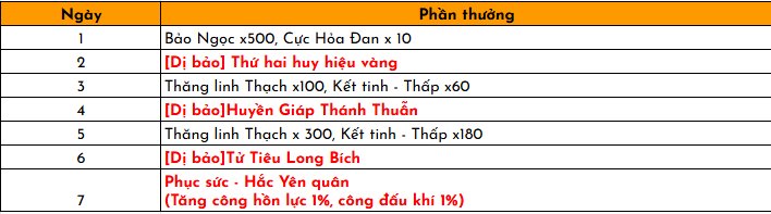 1. Đăng nhập 7 Ngày - Nhận ngay bộ Dị Bảo Địa Giai và Phục Sức VIP Hắc Yên Quân