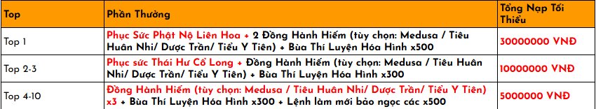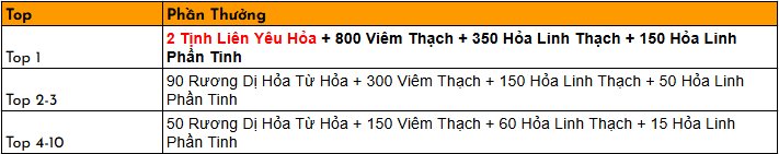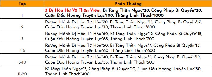 Thể Lệ:Trong thời gian diễn ra sự kiện TOP 20 Đạo Hữu có lực chiến cao nhất ở server đặc biệt sẽ nhận được phần thưởng tương ứng.